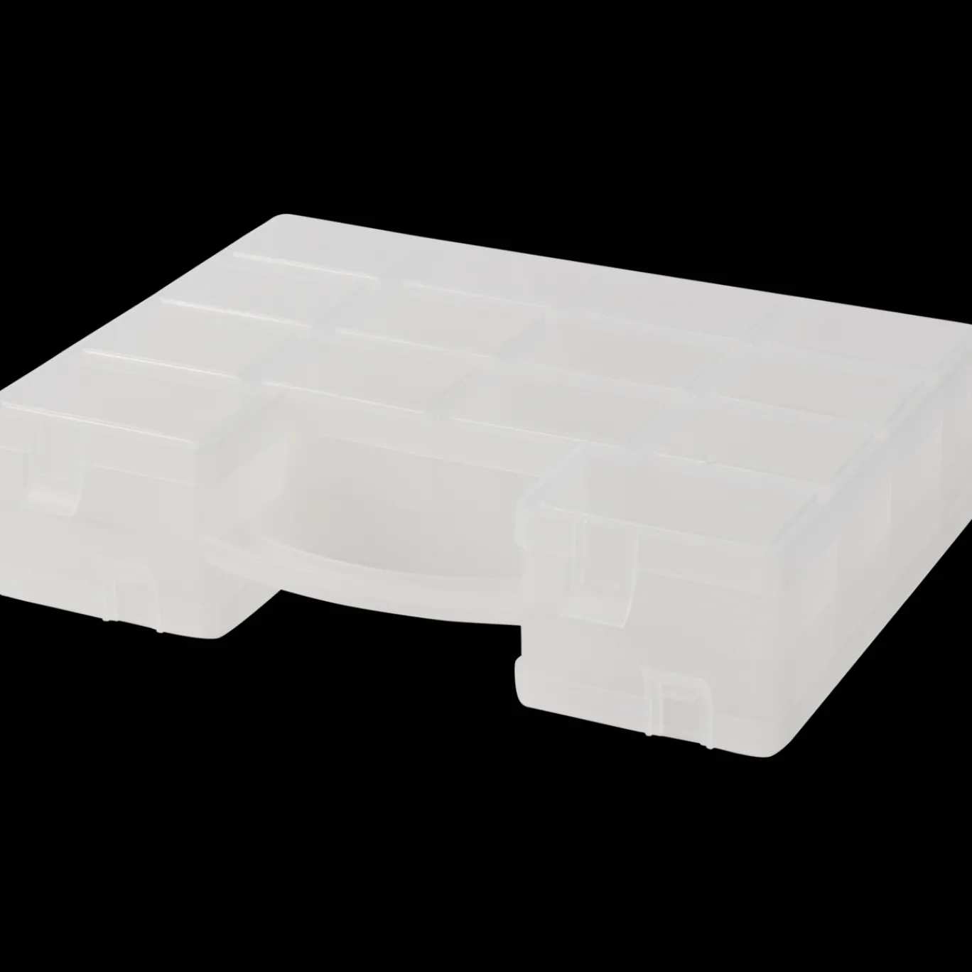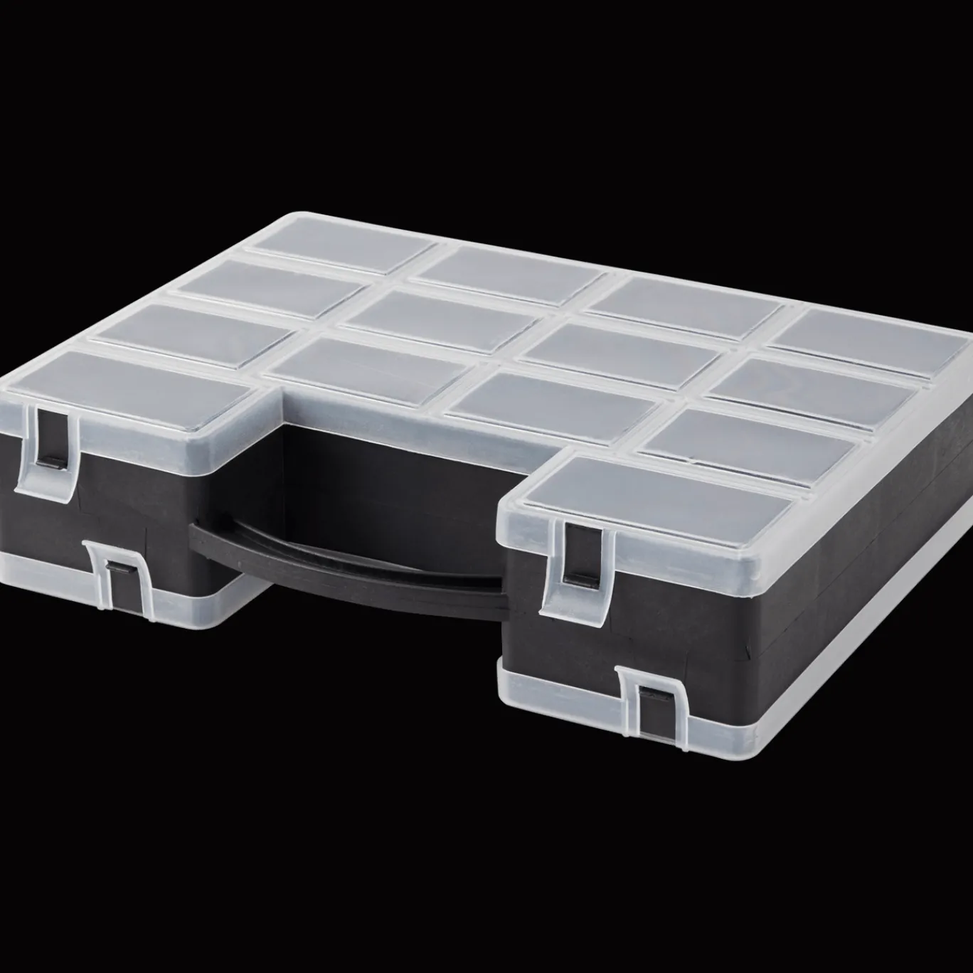 Handige kunststof box met verschillende vakken en handvat, perfect bruikbaar voor het klussen of creatieve hobby’s.