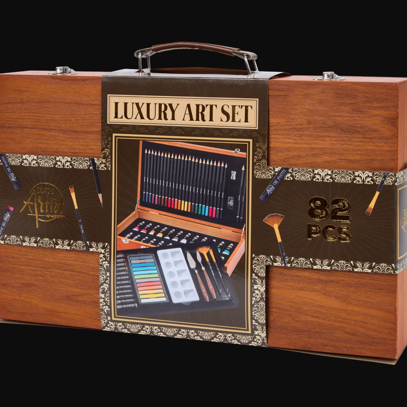 Deze luxe schilderset bevat alles dat je nodig hebt voor eindeloos veel teken- en schilderplezier. In de mooie houten opbergkoffer neem je je spullen overal mee naartoe.