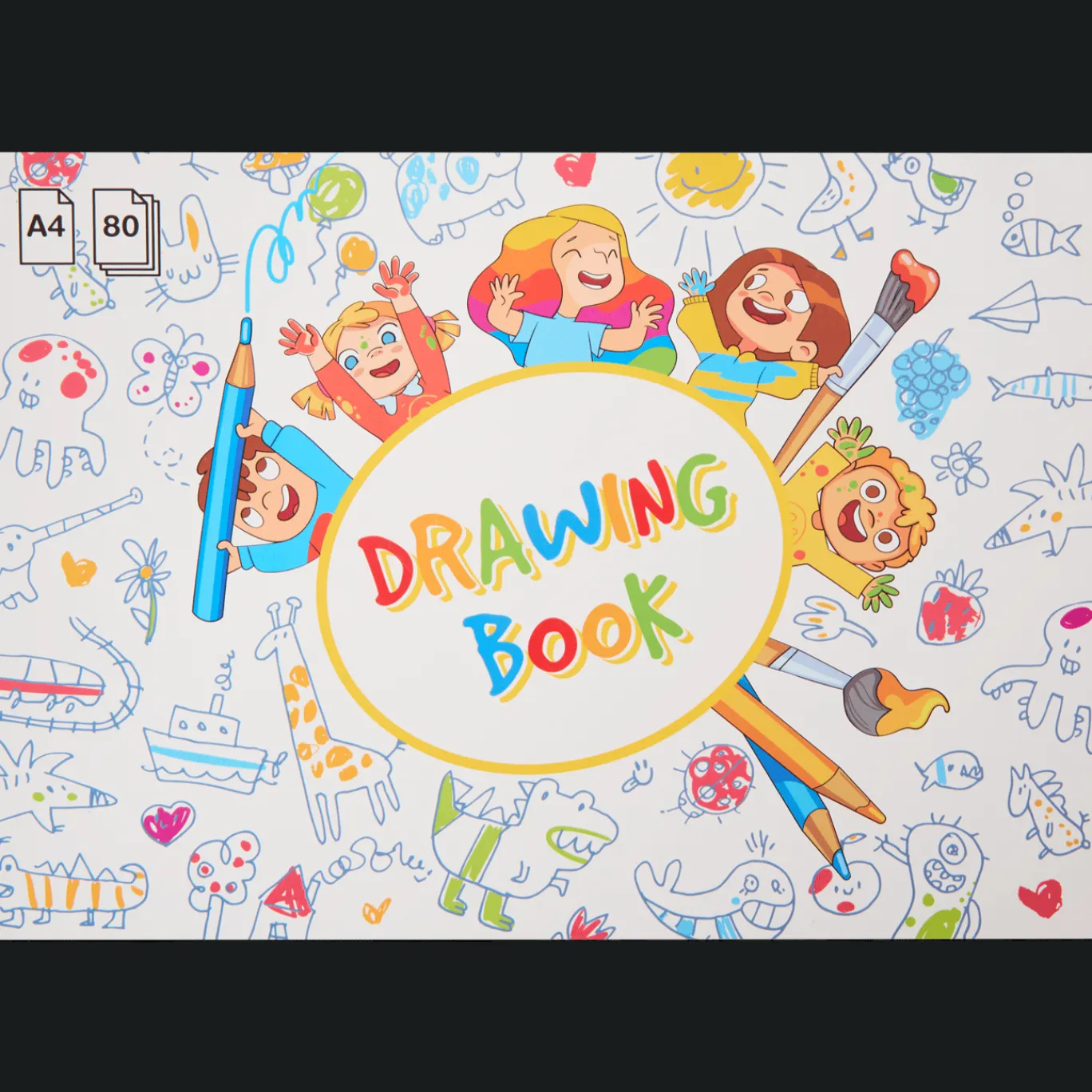 Vrolijk schetsboek speciaal voor kinderen, om de mooiste tekeningen en knutselwerkjes in te maken.