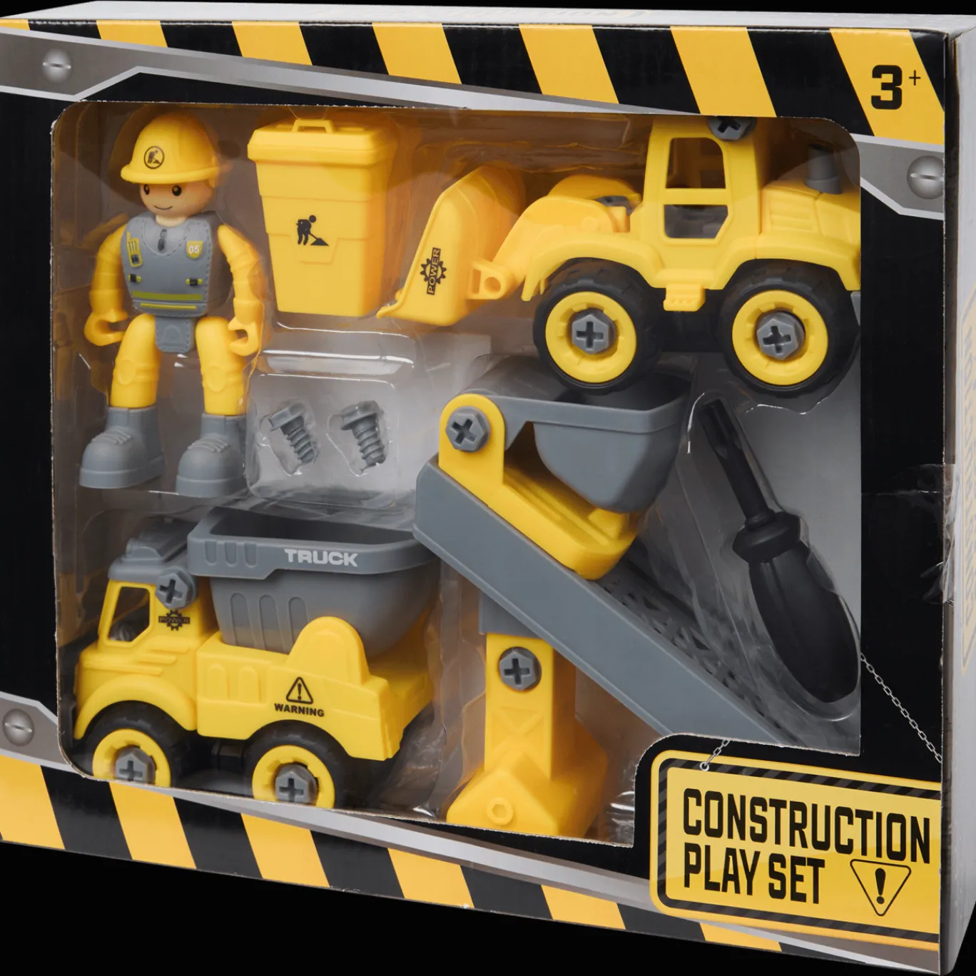 Bouw en sloop constructies met deze 8-delige bouwspeelset. De set bestaat uit 1 vrachtwagen, 1 bulldozer, 1 bouwlift, 1 container, 1 actiefiguur, 1 schroevendraaier en 2 schroeven.