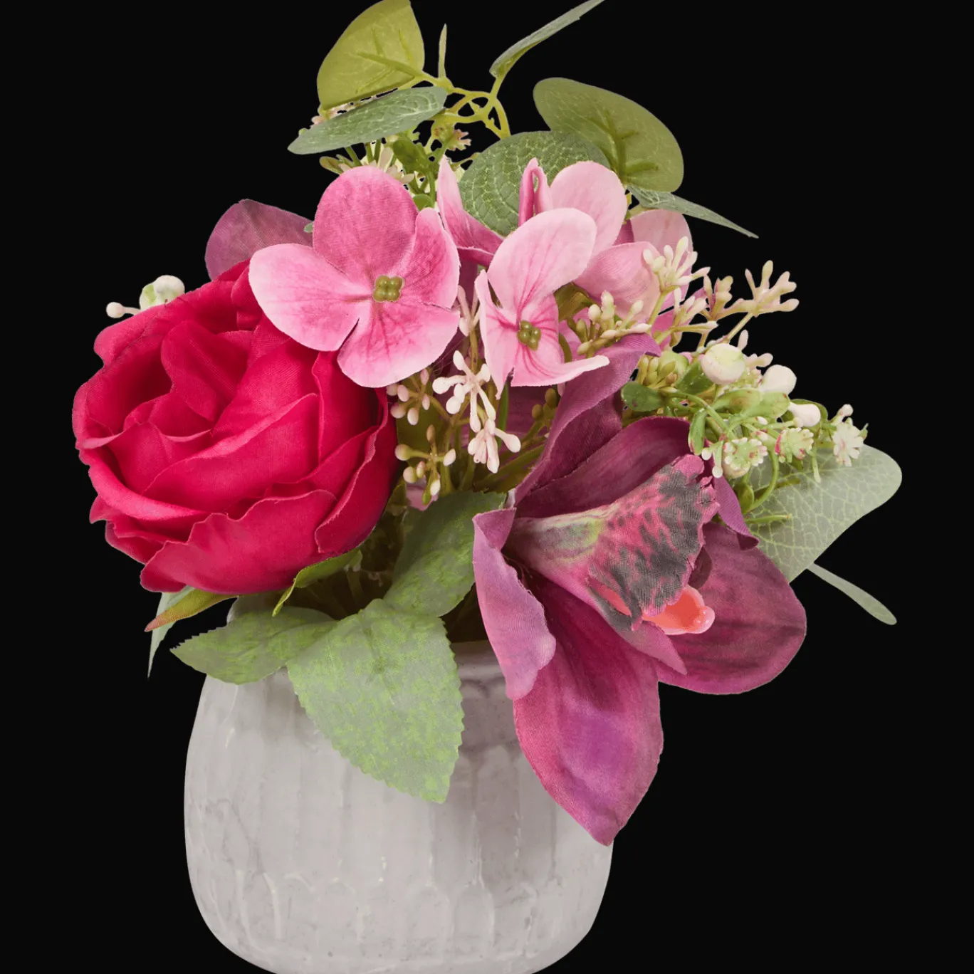 Deze prachtige kunstbloemen in een cementen pot staan het hele jaar door mooi in bloei.