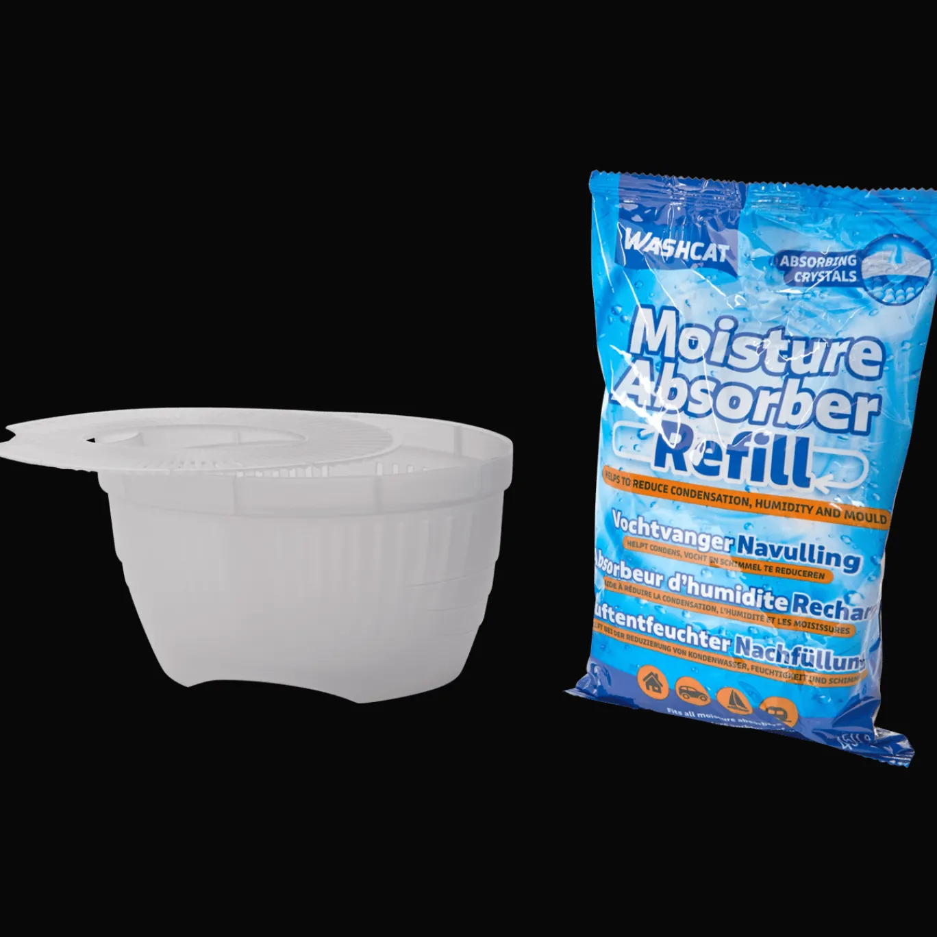 De Washcat vochtvanger is gevuld met absorberende korrels die het vocht opnemen. Zo voorkom je beslagen ramen of condens in huis of in je auto.